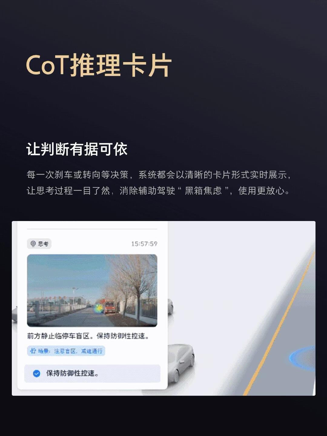 可以直接用“帮我起步”“远离大车”“前方掉头”等自然语言指令控制智驾,CoT思维链卡片把系统“思考过程”可视化,实时显示决策依据;