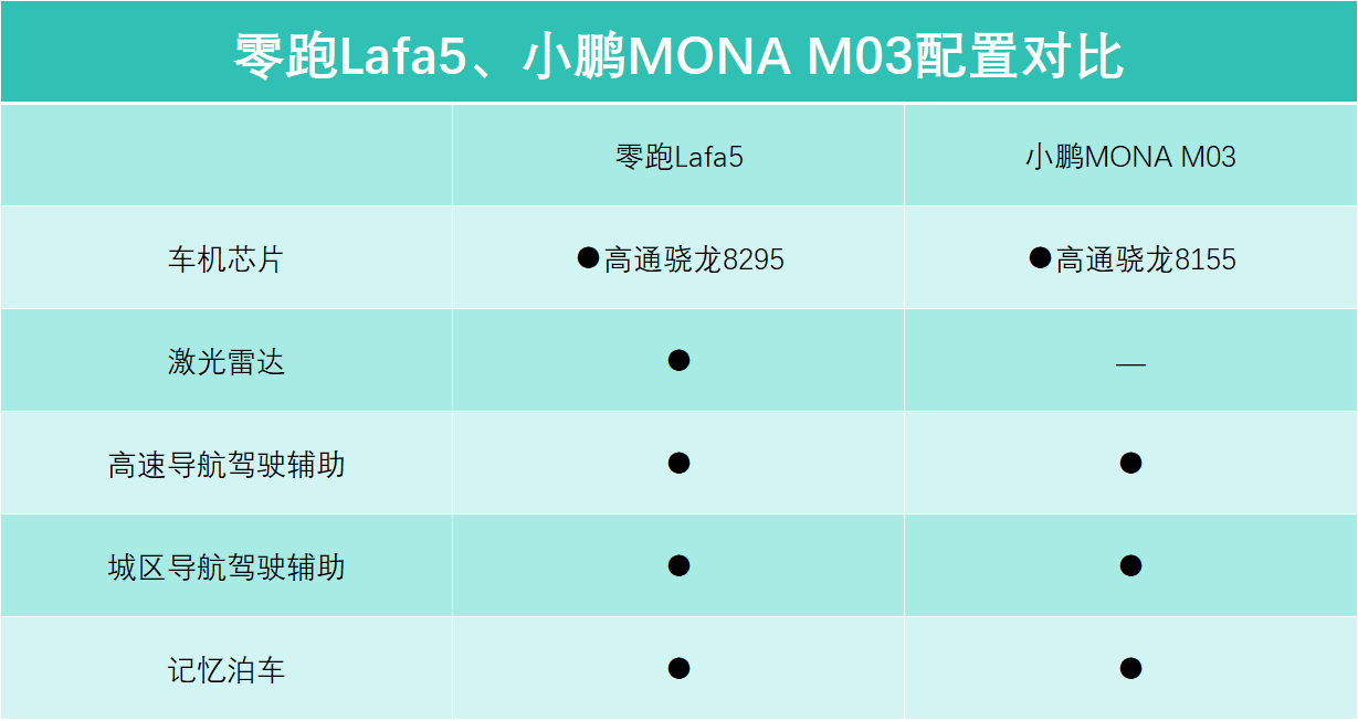 动力部分,零跑Lafa5搭载一台后置驱动电机,最大功率160kW,整车零百加速时间仅需6.5秒,动力很充沛,加上自身精致的尺寸,更方便在车流中穿梭,在城市中通勤,会更得心应手。小鹏MONA M03搭载的是前置电机,最大功率140kW,零百加速时间是7.8秒,其实动力也够用了,毕竟电动机爆发力强、响应速度快,日常代步也够用了。但有一说一,如果是国道跨线超车,或者是高速超越大车,理论上零跑Lafa5还是会更轻松,而且并线时间短,也可以间接提升安全性。