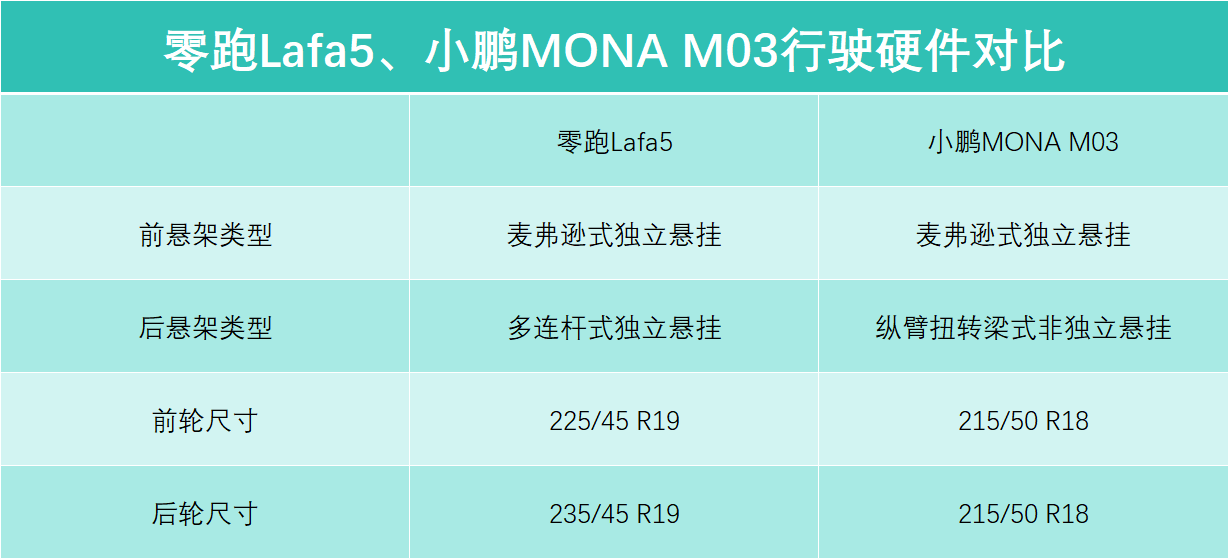 对于追求驾驶体验的年轻人来说,底盘也是重要环节。从悬架结构来看,零跑Lafa5采用前麦弗逊-后多连杆的组合,四轮独悬的配置,在同价位车型中很少见,也属于是很高的规格了。小鹏MONA M03就采用了常规的前麦弗逊-后扭力梁式非独立悬架,其实这也没什么可争议的,毕竟大家都是这么干的。相对来说,零跑Lafa5的四轮独悬,具备更多的可调参数,整体的上限会更高,尤其是对于后排的乘客来说,会更舒适。包括轮胎的规格上,零跑Lafa5作为后驱车,还采用了“子母胎”的组合,前225、后235的轮胎宽度,不仅能提供充足的抓地力,高速行驶时,也可以提升稳定性。小鹏MONA M03前后均为215的胎宽,理论上会更节能,但抓地力就比较中规中矩了。