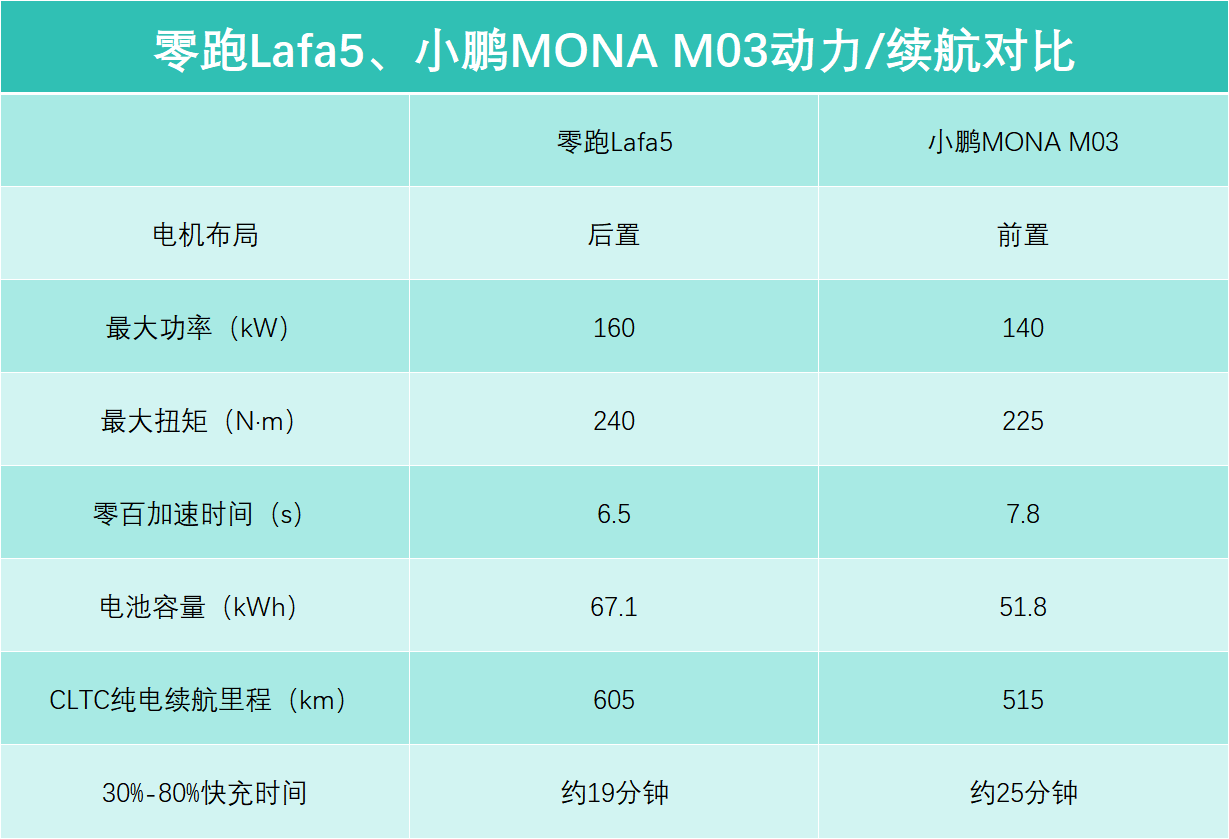 当然,对于纯电动车而言,续航、动力都是关键指标。先来看续航,毕竟这也影响到咱们的出行半径,零跑Lafa5配备了67.1kWh的电池组,纯电续航来到了605km,有一说一,在10万级纯电动车中,妥妥的头部水准。小鹏MONA M03电池组容量是51.8kWh,纯电续航是515km,续航也算不错。如果是日常通勤,两台车基本都能做到一周一充,甚至两周一充,包括城际通勤,二者也不在话下,只不过零跑Lafa5提供了更多的冗余,能够缓解续航焦虑,如果放在最后找充电桩的路上,零跑Lafa5会更从容。另外,零跑Lafa5从30%充到80%,最快只需要约19分钟,小鹏MONA M03需要25分钟,前者也小有优势,如果是长途出行,需要多次充电,零跑Lafa5确实也能节约一些时间,但客观来说,小鹏MONA M03也不会耽误多少事儿。