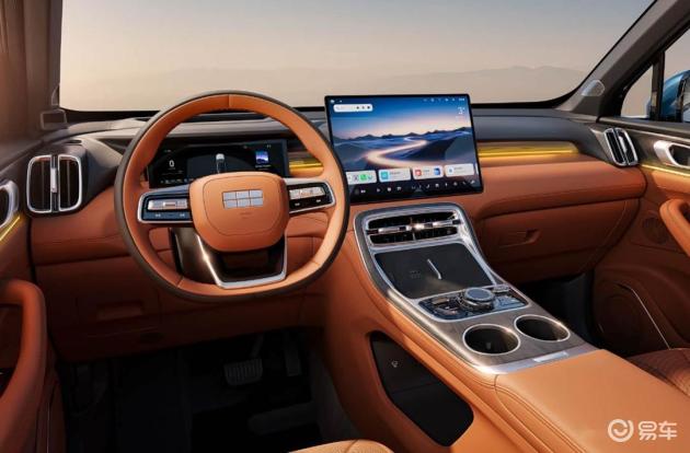 内饰方面,新车延续银河家族的设计风格,采用T字形仪表台,中央配备15.4英寸悬浮式大屏、12.3英寸全液晶仪表屏和HUD抬头显示。最新的Flyme Auto车机系统搭载龙鹰一号芯片,计算能力出色,语音系统支持连续对话、方言识别和多音区识别。双色仪表台采用大面积皮质覆盖,并嵌入256色氛围灯。两侧出风口造型立体,更具环绕感。采用怀挡式电子档位,扶手台储物空间丰富,双手机位支持50W无线快充,同时保留了实体按键区。
