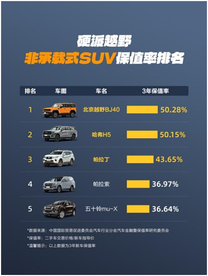 目前,BJ40全球用户总量已经突破30万。根据中国国际贸易促进委员会汽车行业分会汽车金融暨保值率研究委员会发布的“硬派越野非承载式SUV保值率排名”榜单,北京越野BJ40以50.28%的3年保值率强势登顶,进一步印证了其在产品力、用户口碑与长期价值层面的全面领先。