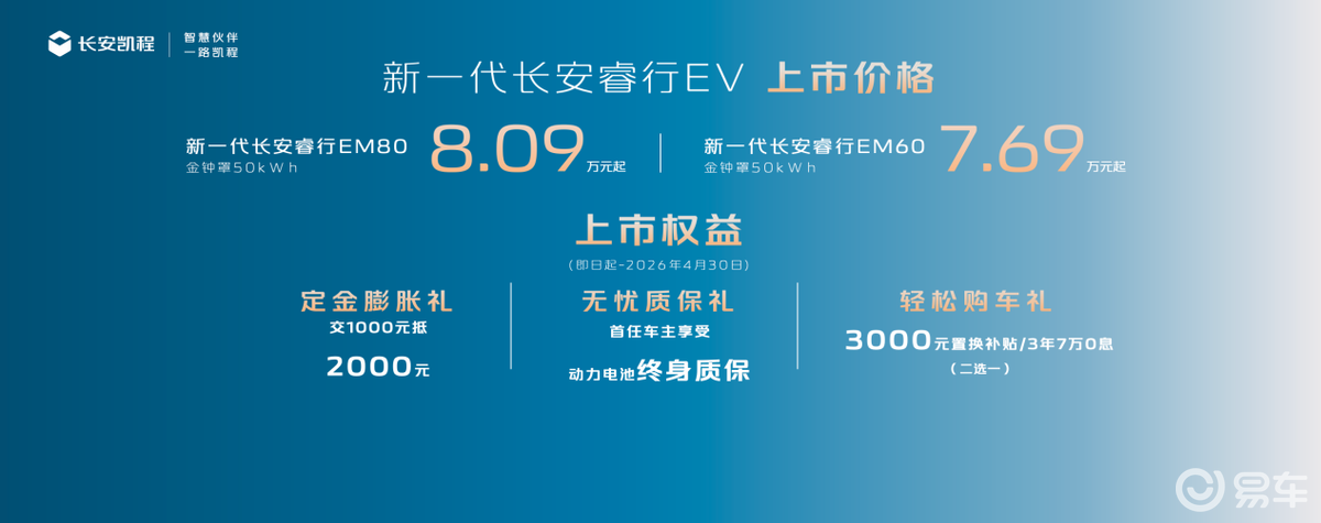 新一代长安睿行EV致力于让每一位物流人轻松拥有“央企品质、超快补能”的创富利器,新一代长安睿行EM80(金钟罩50kWh)官方指导价8.09万元起,新一代长安睿行EM60(金钟罩50kWh)官方指导价7.69万元起!为回馈广大用户,即日起至2026年4月30日下订即享“三大专属宠粉礼”: