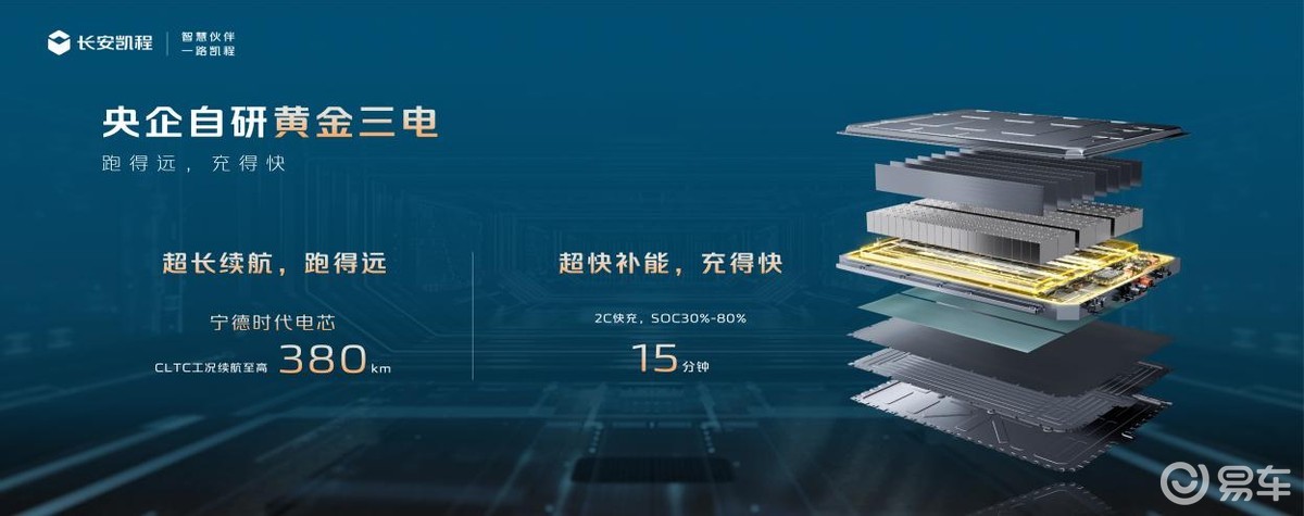 新一代长安睿行EV搭载的央企自研黄金三电系统,专为解决真实痛点而来,实现了电池、电机、电控的深度协同,跑得远、充得快,为您带来1+1+1>3的可靠体验。