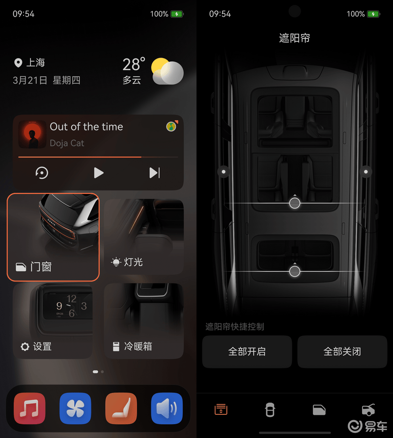 主界面选择「门窗」,点击「遮阳帘」,即可进行一二排全景天窗遮阳帘和三排天幕遮阳帘调节。