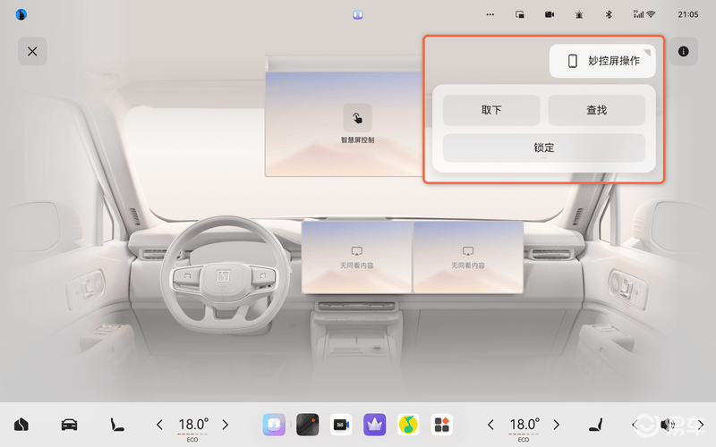 第二步:进入多屏互动主界面,点击「妙控屏操作」,选择「寻找」,妙控屏即会发出蜂鸣声,告知您它所在的位置。同时,您也可以通过中控屏为后排乘客协助操作:取下或锁定妙控屏,既能方便不熟悉操作的家人,也能有效防止儿童误触。需注意的是,以上操作需确保妙控屏与车辆处于连接状态。