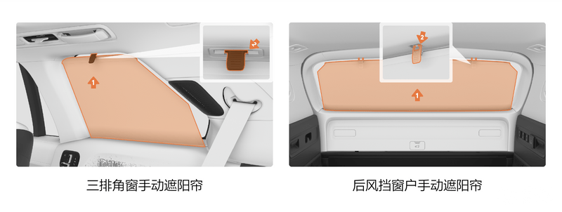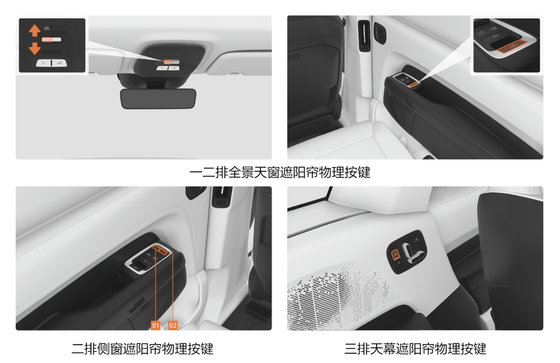 极氪9X共配备了7处遮阳帘,全面覆盖前后排及天窗区域,不仅能有效阻挡阳光直射、提升乘坐舒适性,也为车内乘客提供了良好的私密性。分别为:1个一二排全景天窗遮阳帘2个二排侧窗电动遮阳帘2个三排角窗手动遮阳帘1个三排天幕遮阳帘1个后风挡手动遮阳帘|电动遮阳帘极氪9X的一二排全景天窗遮阳帘、二排侧窗遮阳帘、三排天幕遮阳帘,均为电动遮阳帘,可通过物理按键、中控屏3D车模界面,以及妙控屏进行操作,您还可以通过Eva进行语音控制。