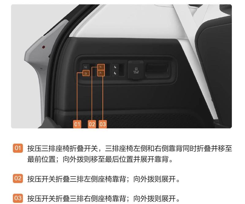 需注意的是:通过物理按键三排座椅靠背折叠/展开,会联动调节对应侧的二排座椅位置。 请在操作前留意,确保不会影响到车内乘客安全或个人物品。