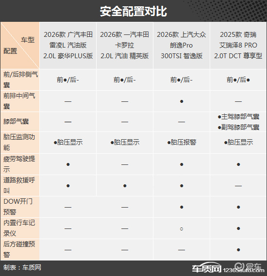四款车型都配备了多项主/被动安全配置,对于车内乘客能够提供较为周全的安全防护。其中,朗逸Pro独享前排中间气囊,而艾瑞泽8 PRO表现更优,所提供的主/副驾膝部气囊、后方碰撞预警等功能均是其他三款车型所不具备的。相比之下,卡罗拉表现垫底。