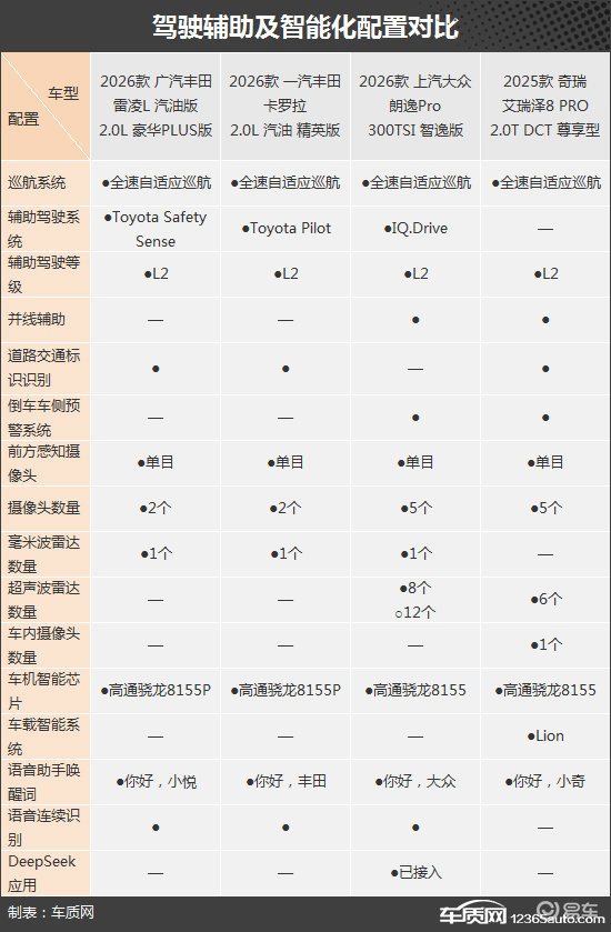 在驾驶辅助硬件方面,四款车型均配备了支持全速自适应巡航的L2级辅助驾驶系统,在功能方面,艾瑞泽8 PRO展现出不俗的实力,朗逸Pro紧随其后,而雷凌L和卡罗拉无论是传感器数量还是功能体验上,都稍显不足。