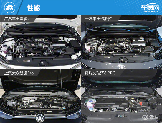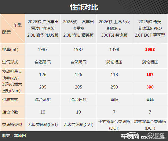 性能方面,四款车型均搭载了燃油发动机,但排量和进气形式有所不同。其中,雷凌L和卡罗拉均搭载2.0L自然吸气发动机+CVT无级变速箱,参数一致。朗逸Pro和艾瑞泽8 PRO均搭载涡轮增压发动机+双离合变速箱的组合,后者发动机排量更大,最大功率和最大扭矩在四款车型中最为出色。