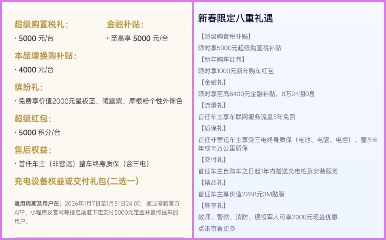 吉利银河(上图右)的购车政策同样丰富,限时5000元的购置税补贴,1000元的新年购车红包,以及首任非营运车主三电终身质保,但整车仅享受6年或15万公里质保。