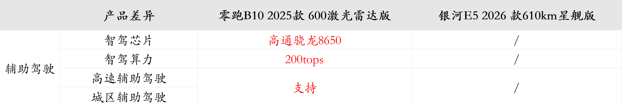 另外,在辅助驾驶方面,零跑B10配备激光雷达,支持高速城市领航辅助,而银河E5全系只有自适应巡航,辅助驾驶功能较单一,如果遇到跑长途的情况,零跑B10的领航功能要更省心一些。