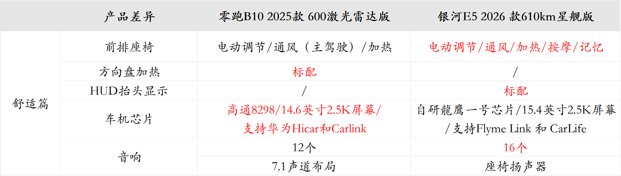 关于音响,零跑B10搭载12个7.1布局的扬声器,银河E5是16个音响,多了座椅扬声器,这个级别的车受限于成本,音响品质相差不大。总体来说,舒适性配置两车各有千秋,差异不大。