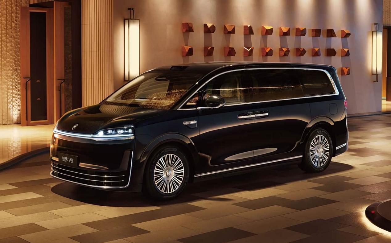 智界V9的车身尺寸,长宽高分别为5359/2009/1879mm,轴距3250mm,是中大型车水平,空间布置上相对轻松。造型方面采用同级车常规的比例结构,前机舱部分相对短促,A柱倾斜度较大,车身后方相对方正以获取更多座舱空间。外饰方面是鸿蒙车系家族风格,较为扁平的灯组内有三颗独立光源,将搭载全新一代DLP投影大灯,支持动态迎宾光毯组合,可自定义迎宾灯语。