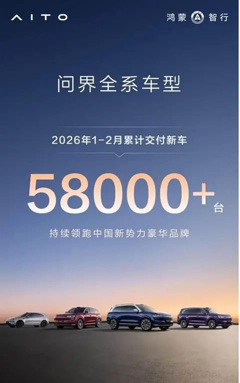 根据问界汽车最新发布的交付数据,其在2026年的前两个月内,已累计向用户交付新车超过5.8万辆。具体到车型,问界M9的总交付量已突破27万辆;问界M8(图片|配置|询价)自上市八个月以来,累计交付超过15万辆;而问界M7系列的整体交付量则已超过40万辆。