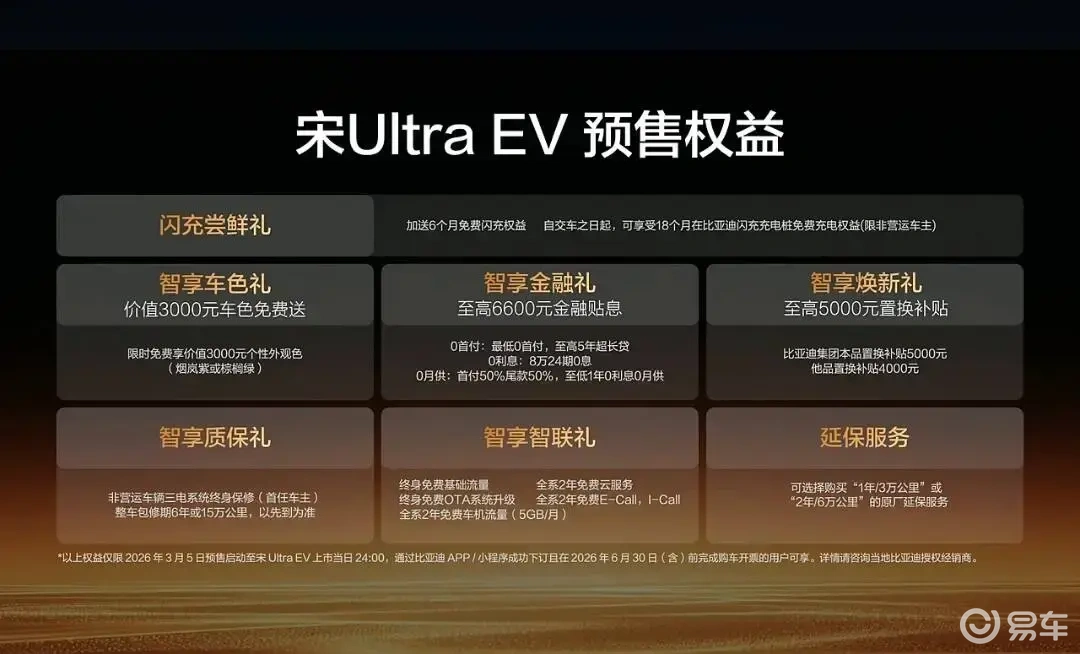 在预售期间下订赠送18个月免费闪充权益(含原12个月+加赠6个月),覆盖全国2万座比亚迪闪充桩,大幅降低日常用车成本。同时享受官方7重礼,其中包括免费选装价值3000元个性外观色(烟岚紫/棕榈绿等6种配色),至高5000元置换补贴(本品额外补贴1000元),金融礼0首付、至高5年超长贷、8万24期0利息等。