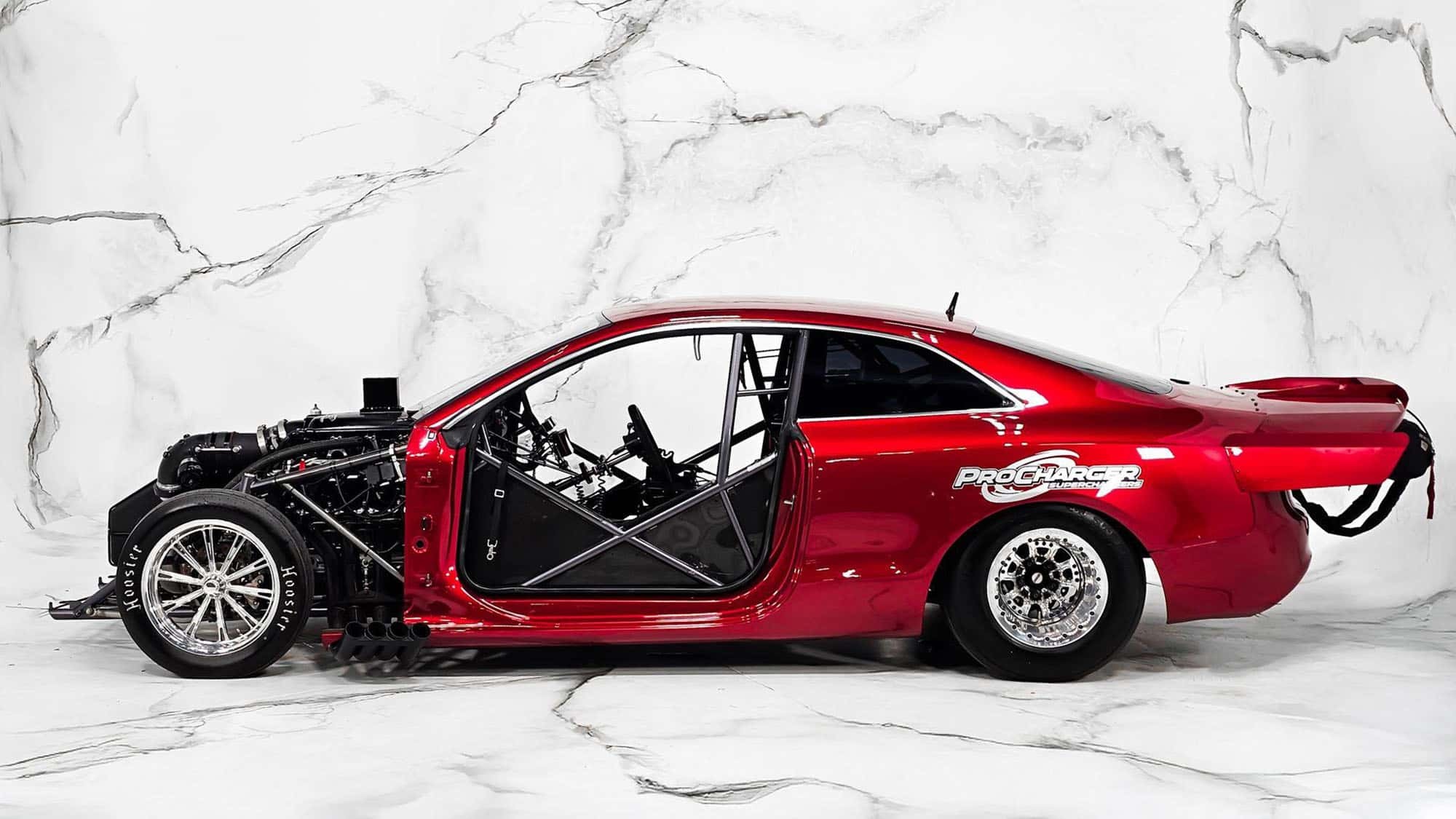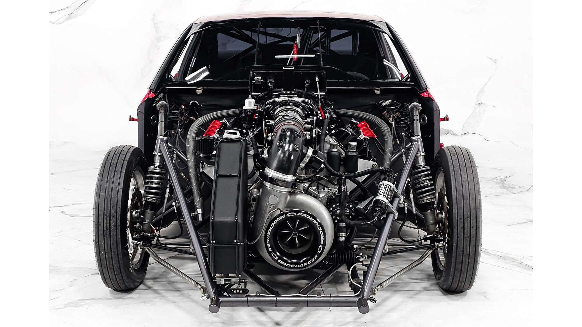 最大亮点就在引擎盖下方,原厂4.2升V8被一台8.8升V8大排量发动机替换,并加装机械增压器。为了额外动力,还使用了氮气系统,这种配置在直线加速比赛中非常典型,这台车曾在比赛中使用。