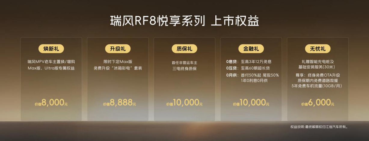 近日,在江汽集团旗下瑞风品牌用户之夜上,瑞风RF8悦享系列正式上市。新车共推出三款配置车型,市场指导价区间为19.99万-25.99万元,限时抢购价17.69万-22.69万元,并附带综合价值最高70888元的上市权益。