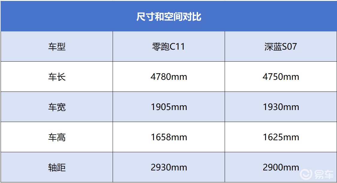 从数据来看,深蓝S07的车宽有一定优势,可能对于车内的横向空间有一定增益;零跑C11则是在车长、车高、轴距方面有优势,正好这几个数据又是直接关系到后排腿部、头部空间的,所以理论上来说零跑C11的车内空间会更宽敞。