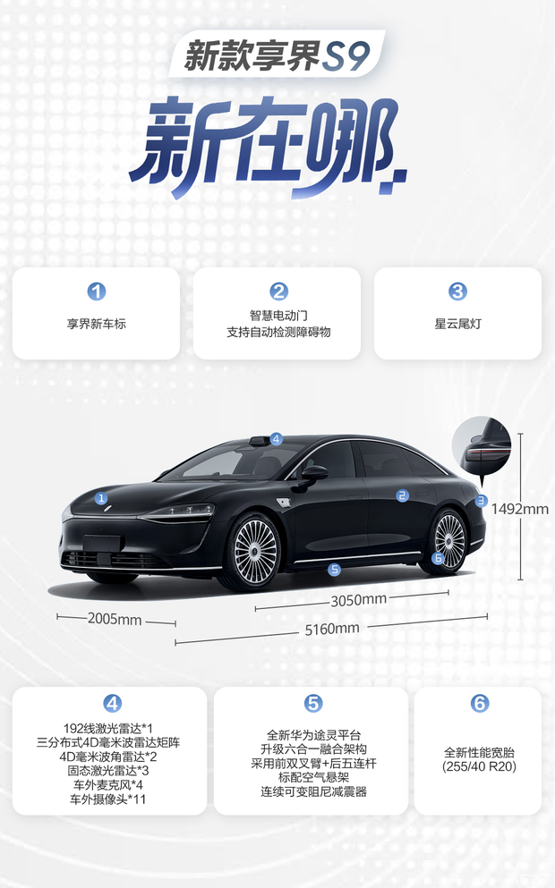 [汽车之家 新车官图] 10月27日,我们从享界品牌获取到了旗下中大型轿车——新款享界S9(参数|询价)官图。该车将针对外观进行调整,并搭载新车标、全新星云尾灯、全新轮圈样式、星河大灯,支持选配智慧电动门、智能电子外后视镜、华为百万像素智慧大灯等。同时,该车还将搭载36个高精度传感器,标配四激光雷达,前向升级3分布式毫米波雷达矩阵,并新增车外麦克风。动力形式方面,将继续提供纯电和增程两种形式,并将在11月完成上市。